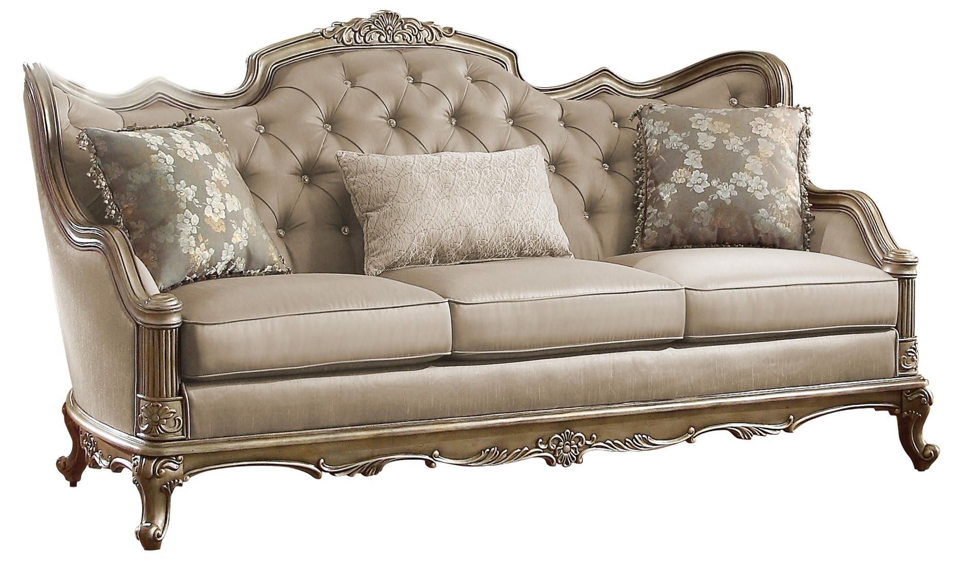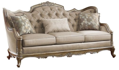 The elaborate designs of Old World Europe are treated with a distinct modern touch in the Florentina Collection. The eye-catching jewel tufting reflects with a brilliance intended to accentuate the dusky taupe colouring of the faux silk and the rich silver, with gold undertone finish of the show wood frame. With details such as shell and acanthus leaf scrolling, routed pilaster and cabriole legs, the traditional look of the collection is solidified. The accenting faux silk toss pillows feature traditional fringe detailing and a complementing detail pattern. The series 8412 Florentina Seating and Occasional Collections complement the Homelegance series 1867 Florentina Bedroom and Dining Collections.Read More