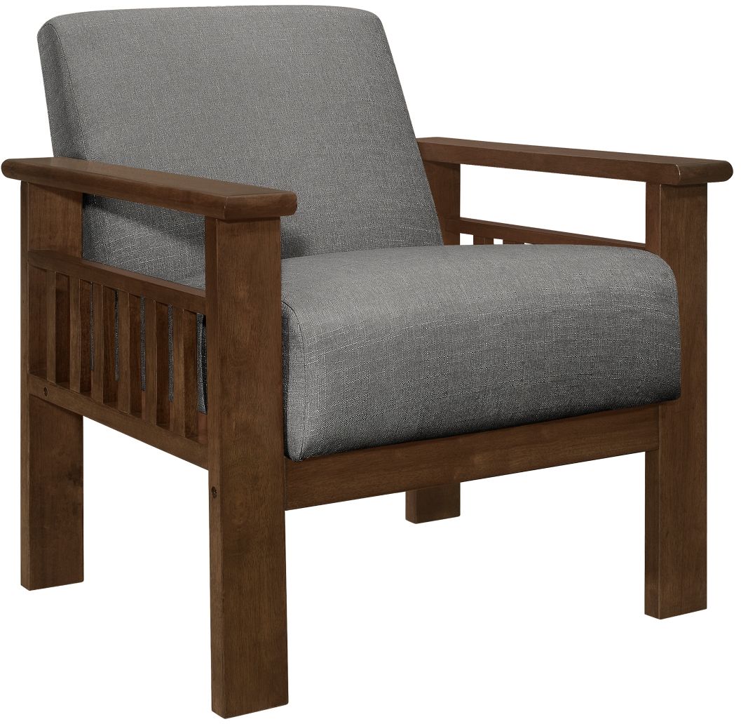Providing accent to the transitional surroundings of your home is the Helena Collection. Styled with a nod to the Arts & Crafts era, the chair’s solid wood construction features a walnut finish, gray fabric upholstery and vertical slat accent on the arms.Read More