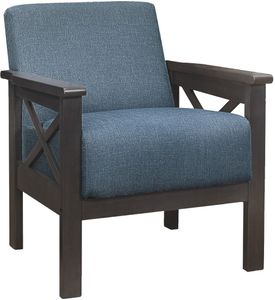 Designed with inspiration from the Arts & Crafts movement, the Herriman Collection will be a classic addition to your home’s décor. The legs and x-framed wood arms are finished in an antique grey, providing complementing contrast to the blue linen-like fabric covering.
