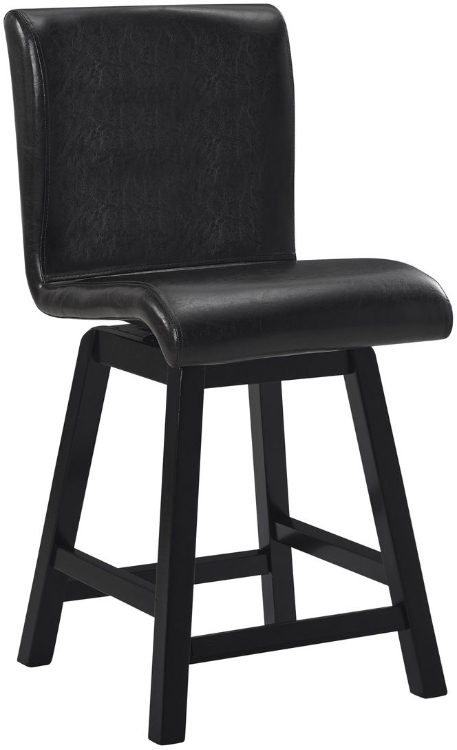 Providing functional accent to your casual dining space is the Hillshaw Collection. The dark brown faux leather upholstered 24-inch counter height chair allows for perfect placement within your casual dining space. The tailored profile of the swivel seat and chairback back are accented by dark brown finished wood legs.Read More