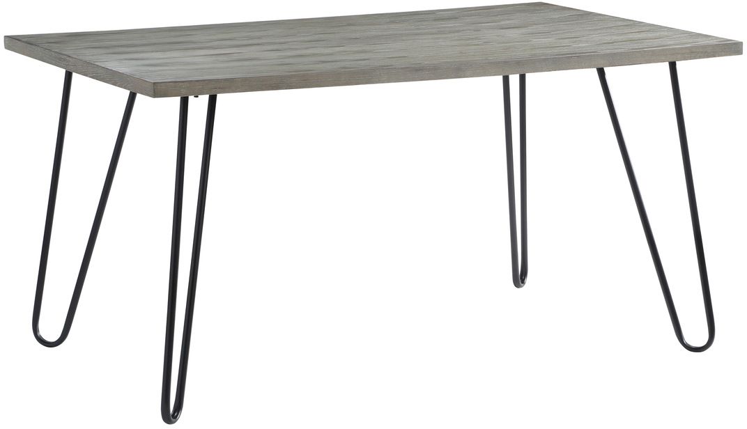 A gray finish over oak veneer subtly highlights the distinct grain of the wood, while lending neutral contrast to the three available -blue, orange, and gray - velvet upholstered coverings of the accompanying side chairs. Black-finished hairpin legs support the table’s fixed top.