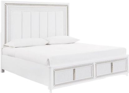 Includes California king upholstered headboard, storage footboard, rails and roll slats