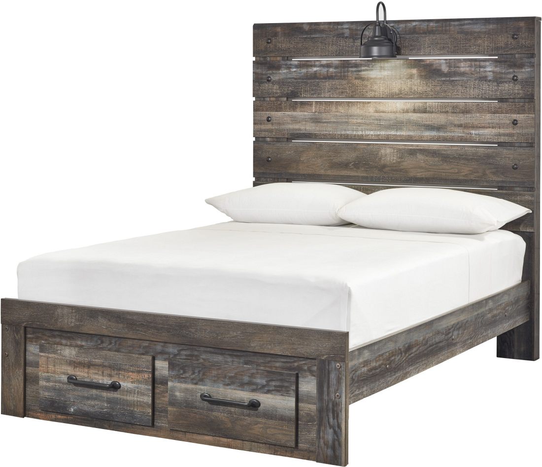 Rustic and endearing! The Drystan full panel bed is built with a replicated wood grain and a rustic dark finish. Storage footboard provides 2 smooth-gliding drawers for extra bedding. The light sconce and USB ports make bedside reading and device charging a breeze.