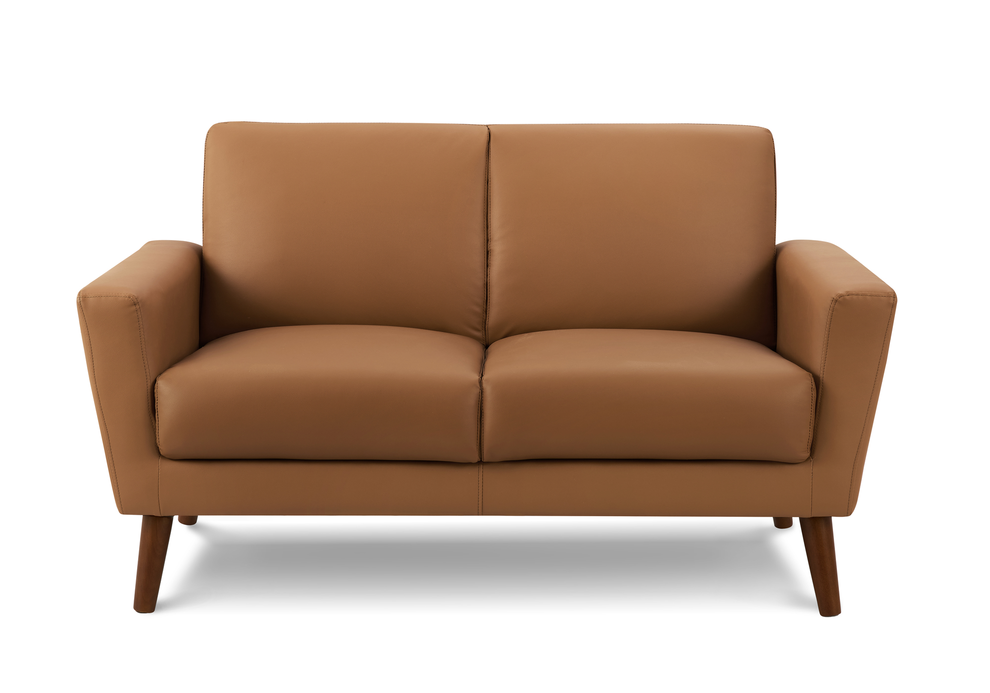 Cette causeuse inspirée du milieu du siècle, d'une longueur de 58 pouces, se caractérise par une riche finition en similicuir cognac, des lignes rembourrées élégantes et des pieds en bois de noyer chaleureux, ce qui en fait un ajout remarquable aux salons modernes et aux espaces élégants