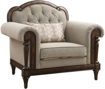 Le tissu brun aux teintes neutres donne le ton à la présentation raffinée de la chaise. Le dessus de l'assise en chenille, le coussin de rein coordonné, le capitonnage à boutons et les moulures donnent un accent complémentaire à l'ensemble.Read More