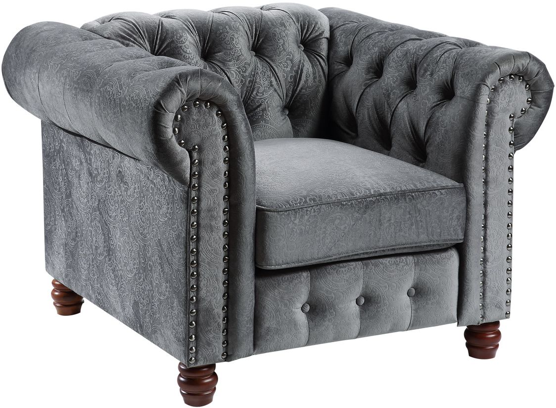 Ce fauteuil de style Chesterfield est recouvert de velours gris foncé et présente les accents classiques des boutons, des bras fortement enroulés et des têtes de clous. Les pieds en bois au fini cerisier offrent un soutien tout en complétant le ton neutre du velours.Read More