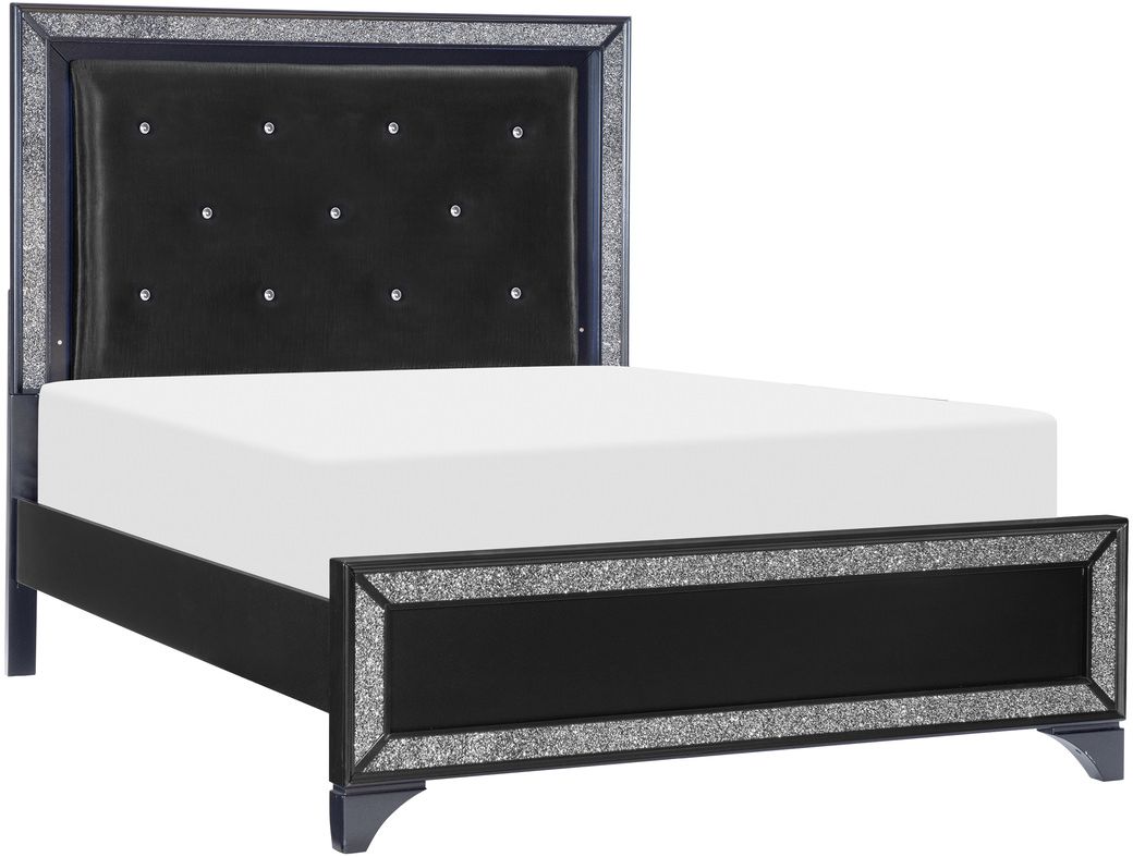 Le fini nacré noir est rehaussé par la garniture pailletée argentée qui encadre le profil du lit. La tête pour grand lit est dotée d'un insert en similicuir rembourré, accentué par des boutons en faux cristal et un rétroéclairage par DEL, qui constitue la pièce centrale de cette collection étincelante.Read More