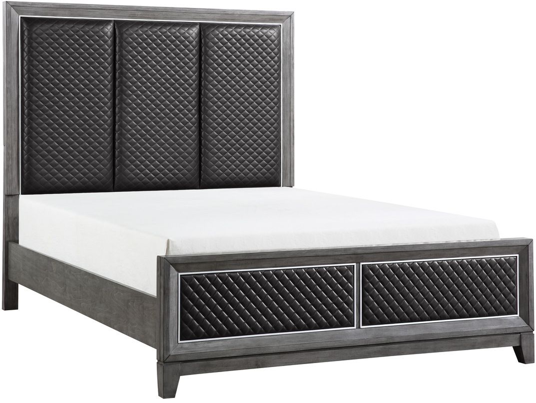 Des accents argentés peints encadrent les façades en similicuir gris à motifs de losanges du grand lit, chacun offrant un contraste complémentaire au fini brossé gris du placage de bouleau de la collection.Read More