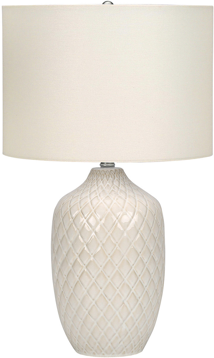 La lampe en forme de pot de gingembre de 25 po de haut est dotée d'une base en céramique crème émaillée avec une texture géométrique en forme de diamant et d'un abat-jour en lin ivoire, terminé par un fleuron argenté sur le dessus.Read More